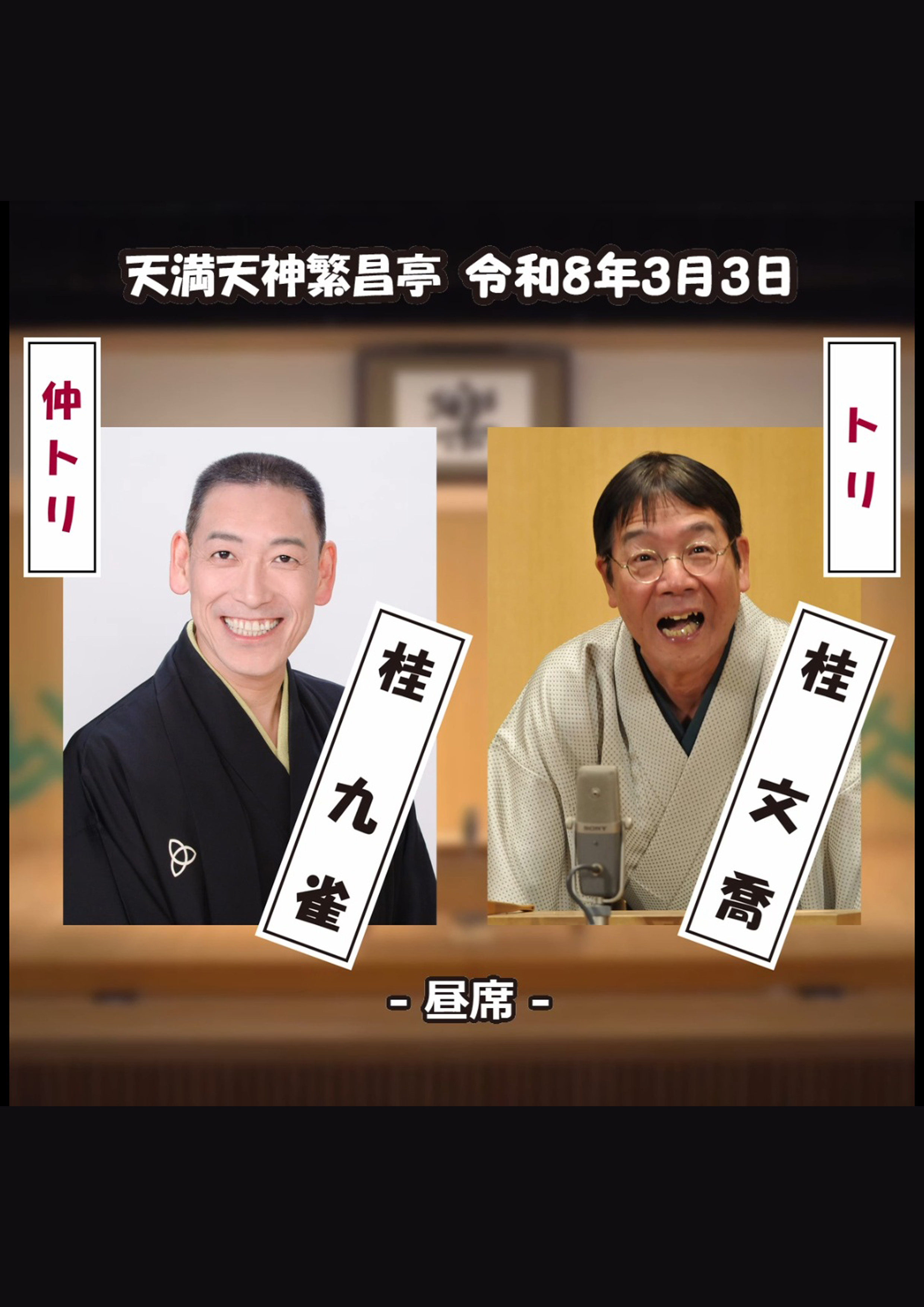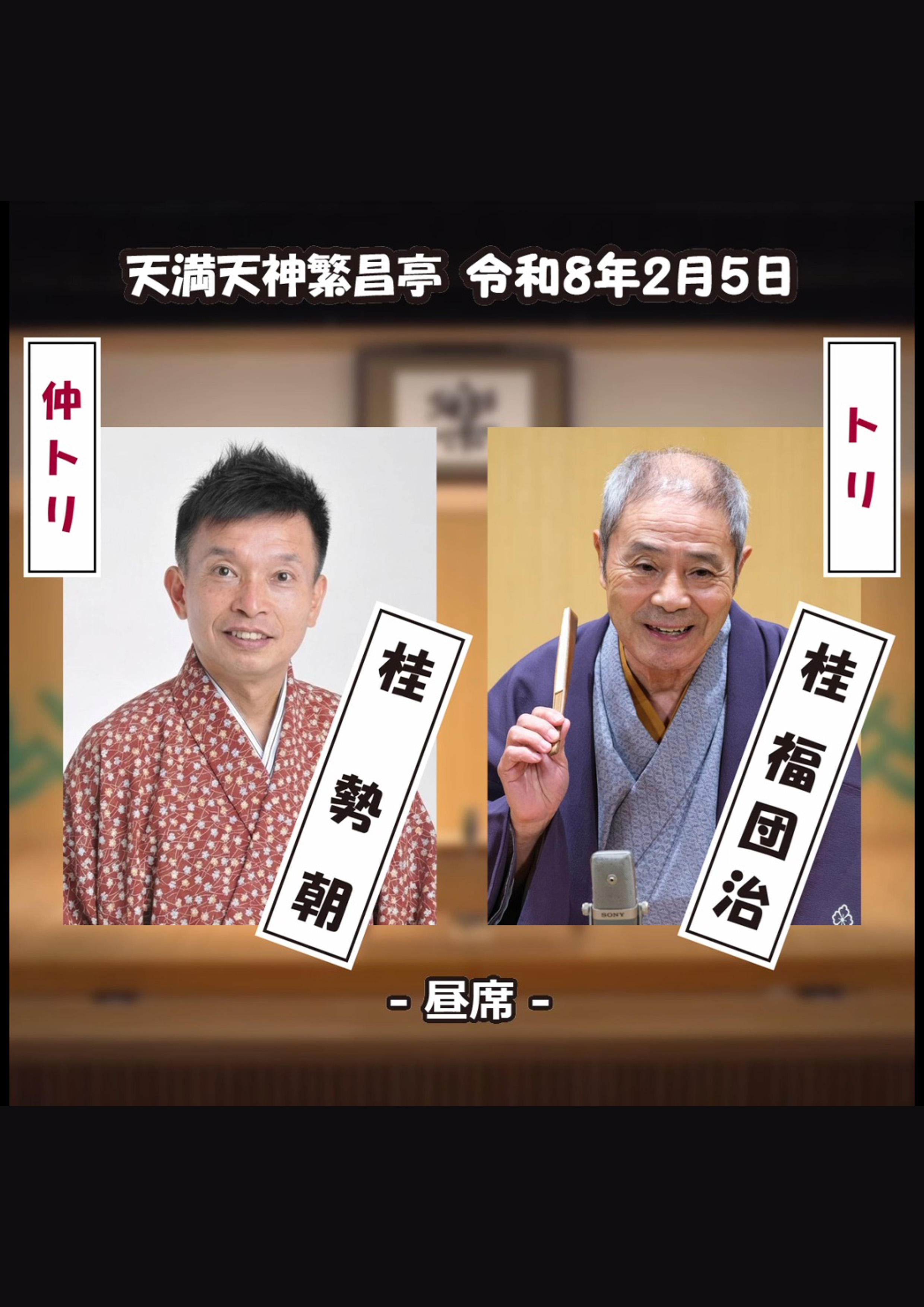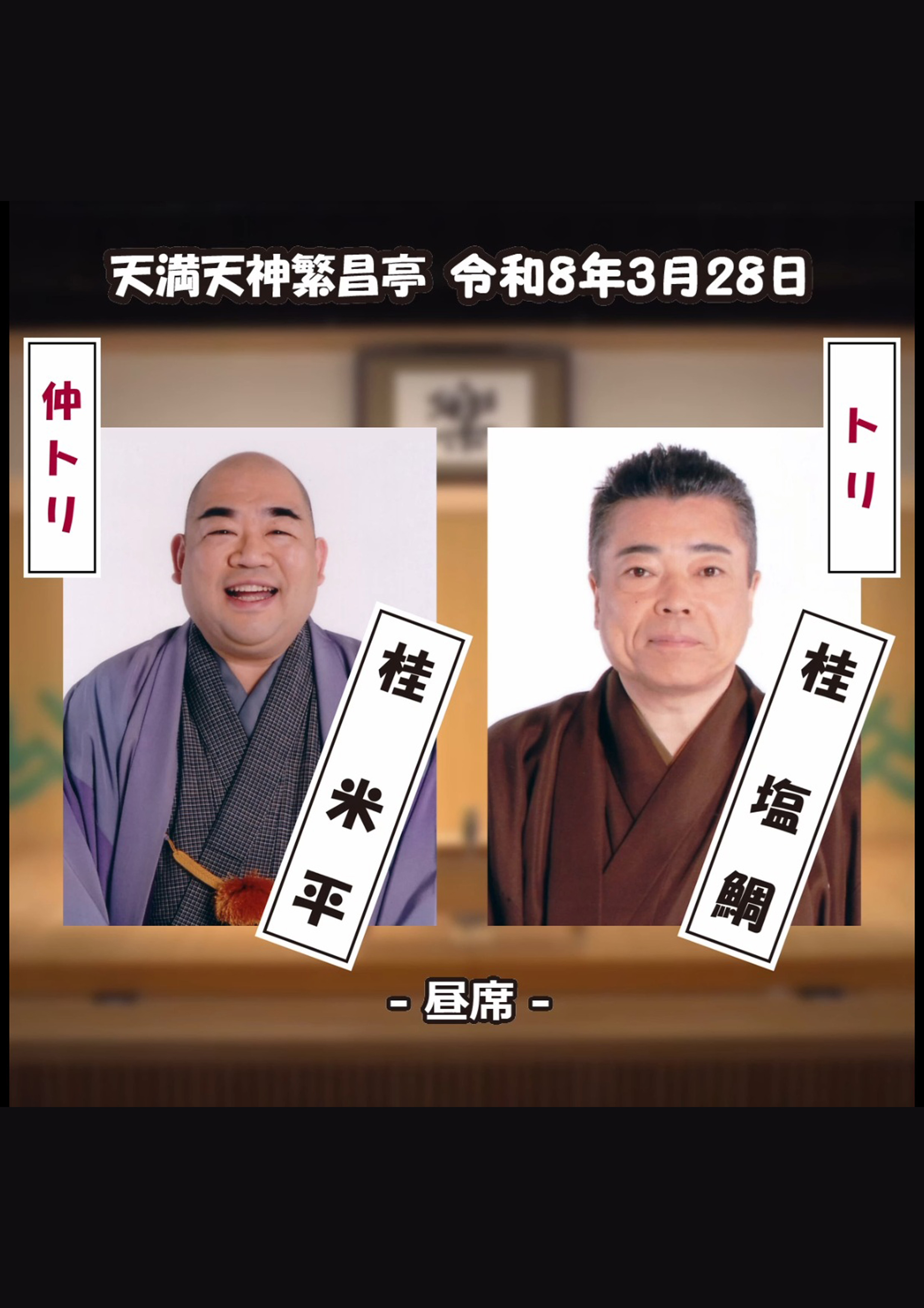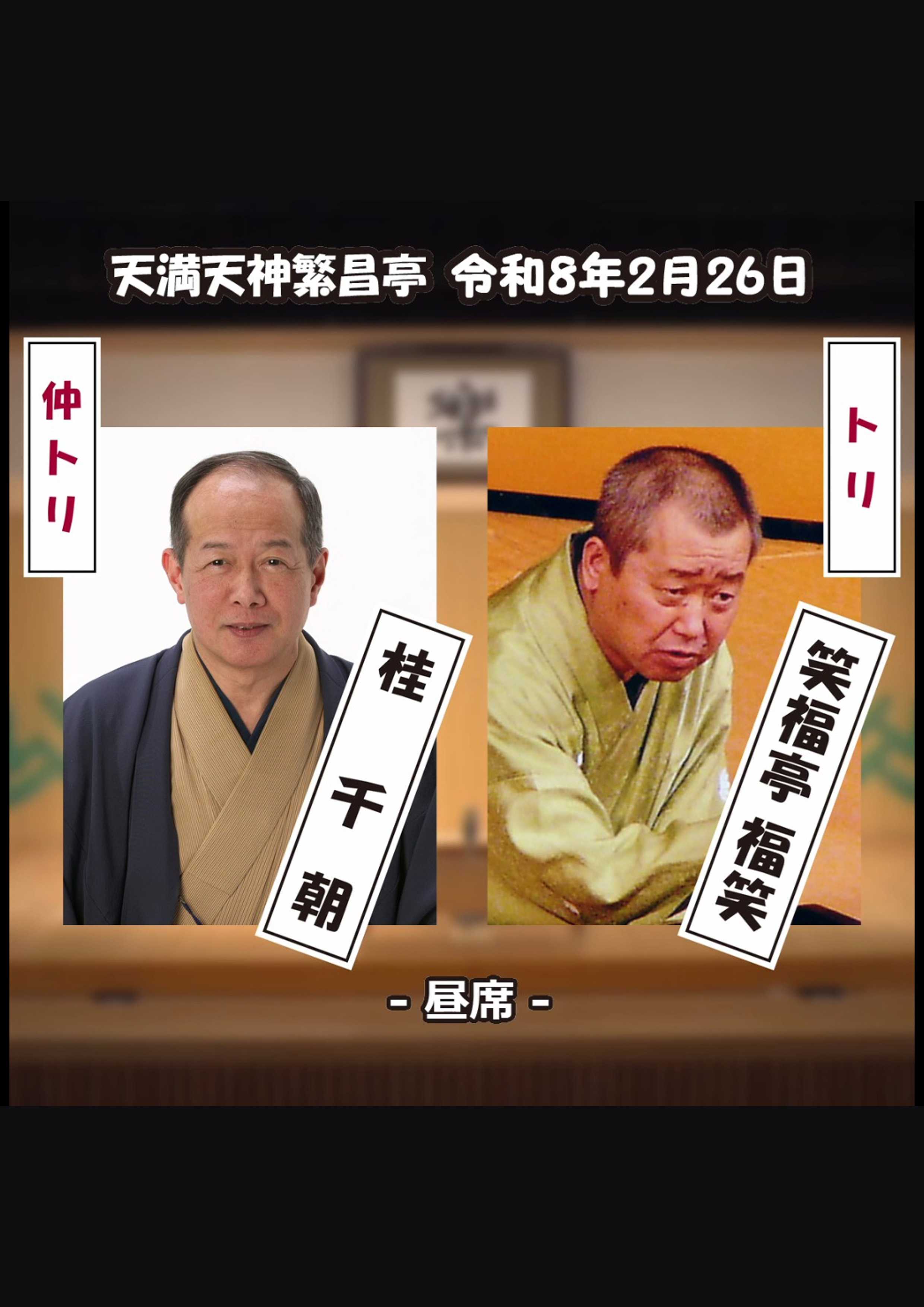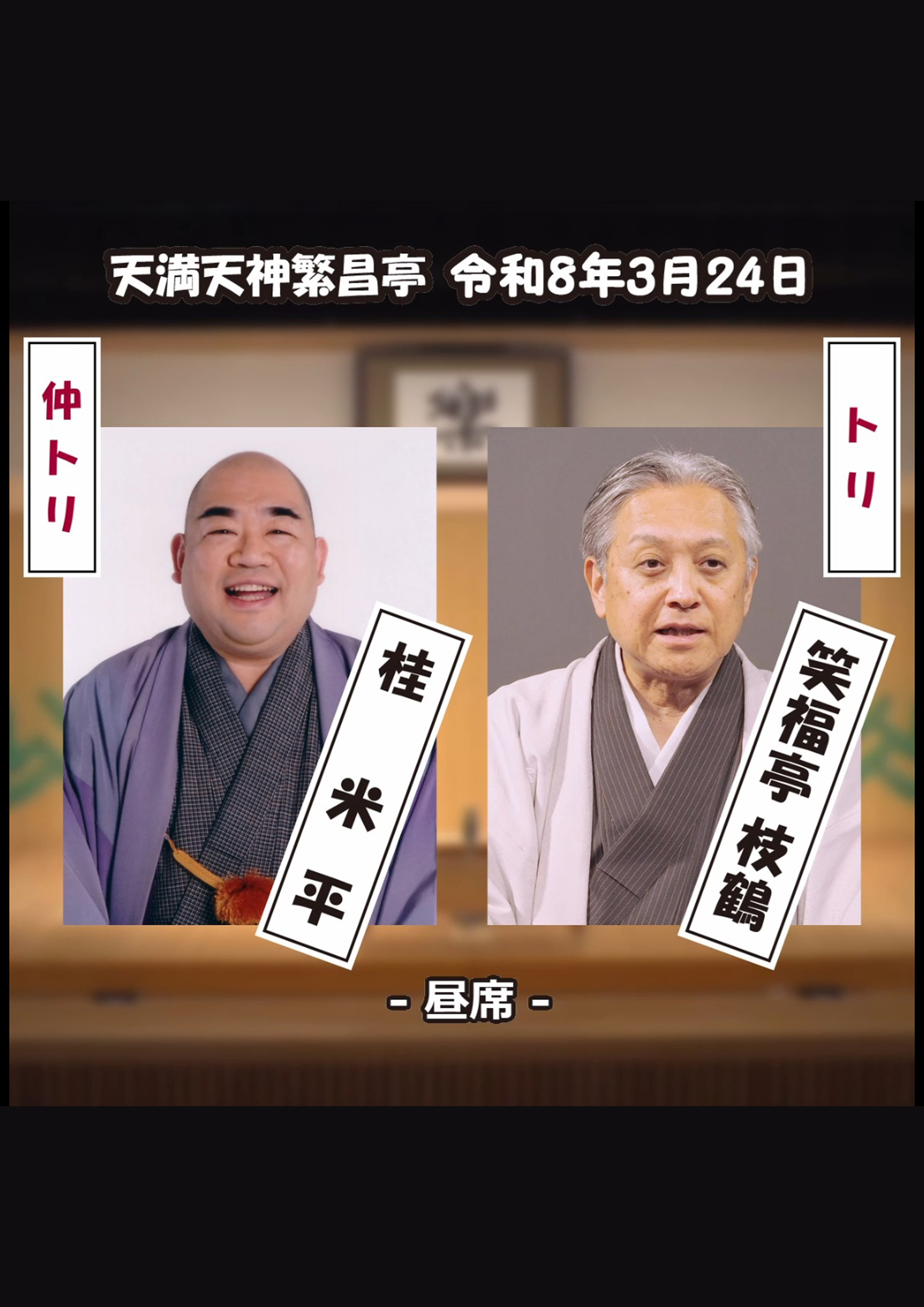 桂福留/月亭方気/桂吉の丞/おせつときょうた(漫才)/笑福亭瓶吾※/桂米平~仲入~笑福亭松五/桂文華/喜味家たまご(三味線放談)/笑福亭仁智(※…配信はございません。)