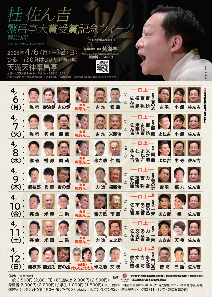 桂弥壱/月亭秀都/桂鯛蔵/暁あんこ(曲芸)/桂吉坊/桂米団治~仲入~記念口上/桂よね吉※/桂小鯛/桂佐ん吉(※…配信はございません。)