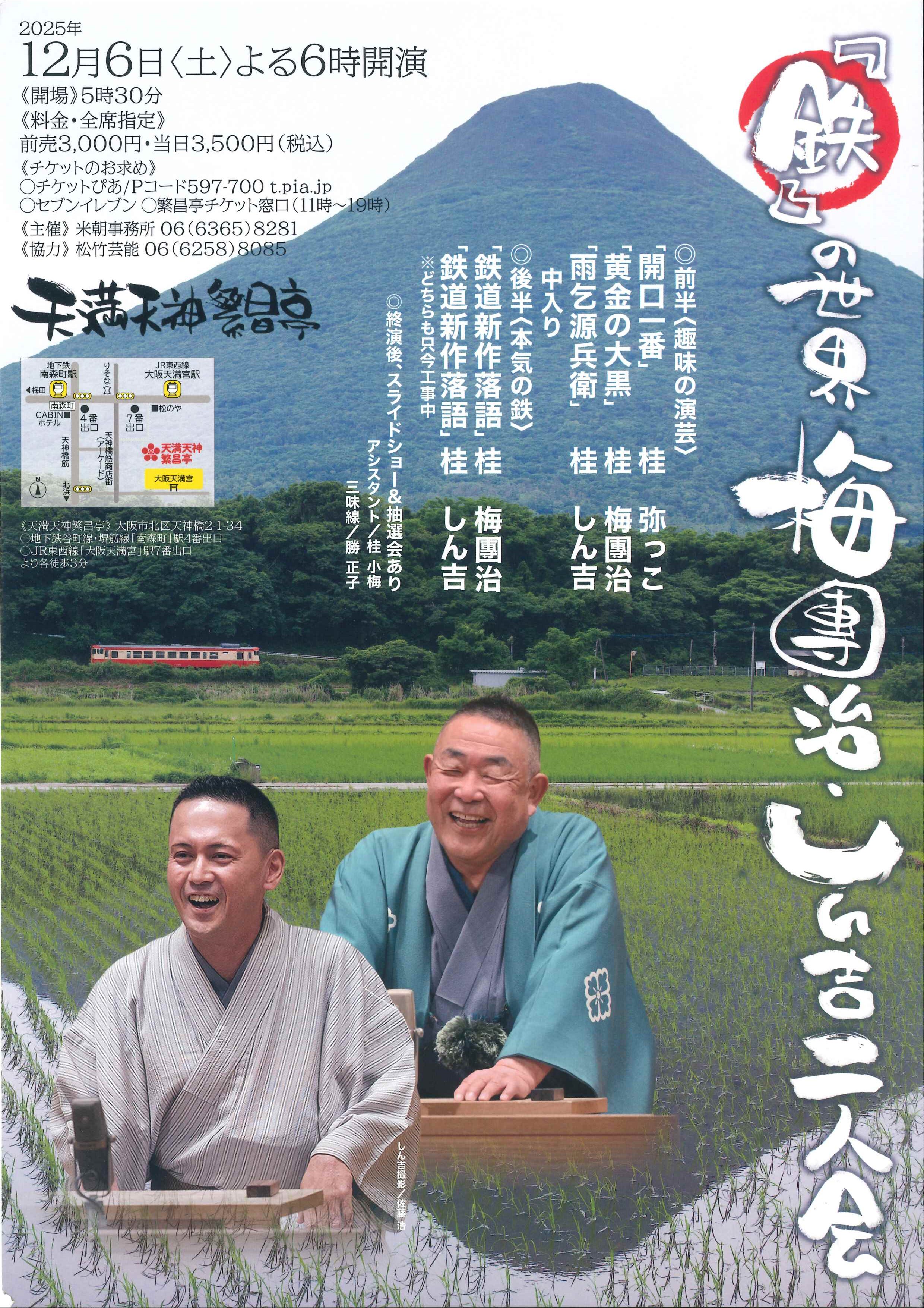 前半(趣味の演芸):桂弥っこ「開口一番」/桂梅団治「黄金の大黒」/桂しん吉「雨乞源兵衛」~仲入~後半(本気の鉄):桂梅団治「鉄道新作落語」(只今工事中)/桂しん吉「鉄道新作落語」(只今工事中) ※終演後、スライドショー・抽選会あり(アシスタント:桂小梅)