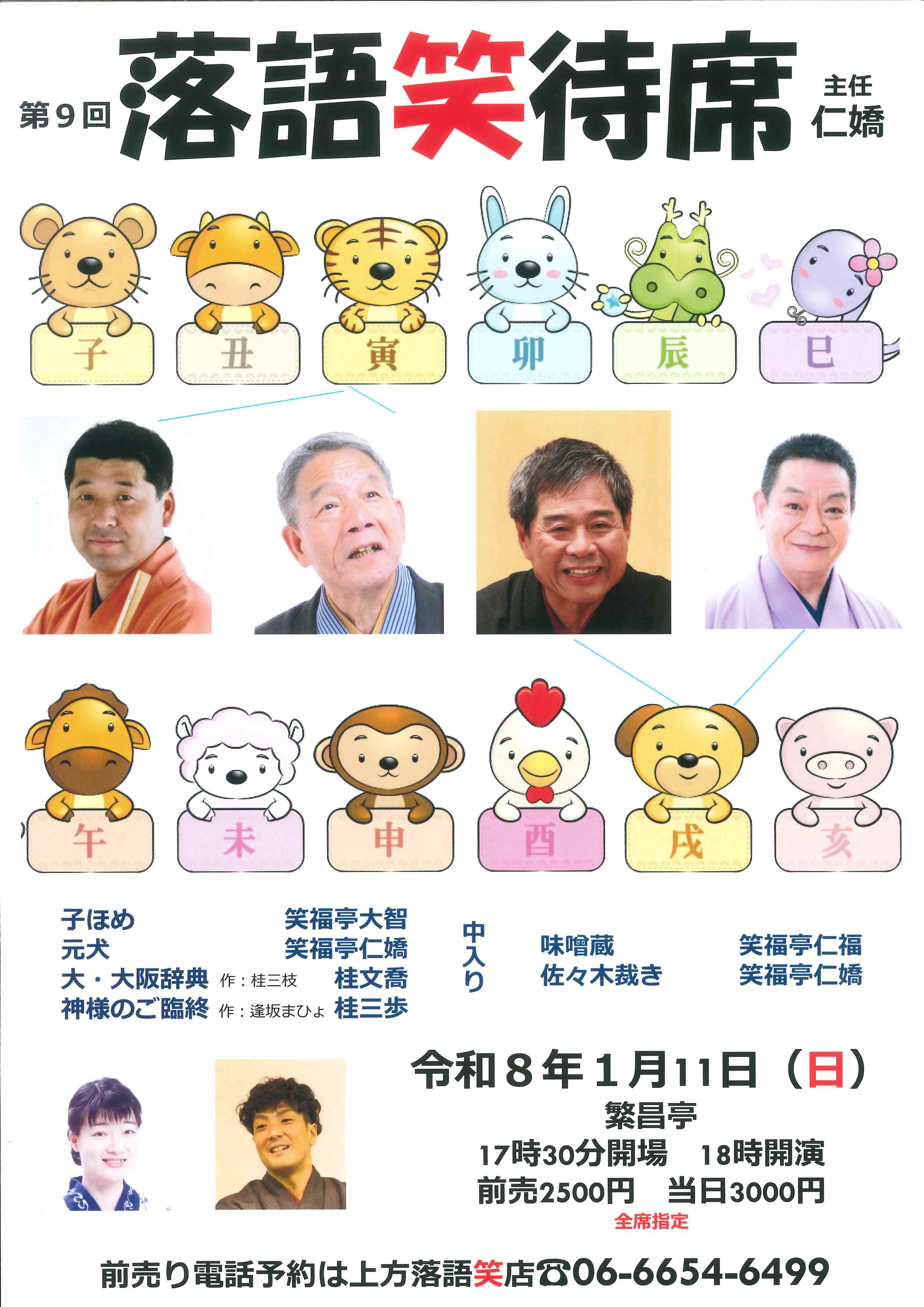 笑福亭大智「子ほめ」/笑福亭仁嬌「元犬」/桂文喬「大・大阪辞典(作・桂三枝)」/桂三歩「神様のご臨終(作・逢坂まひょ)」~仲入~笑福亭仁福「味噌蔵」/笑福亭仁嬌「佐々木裁き」