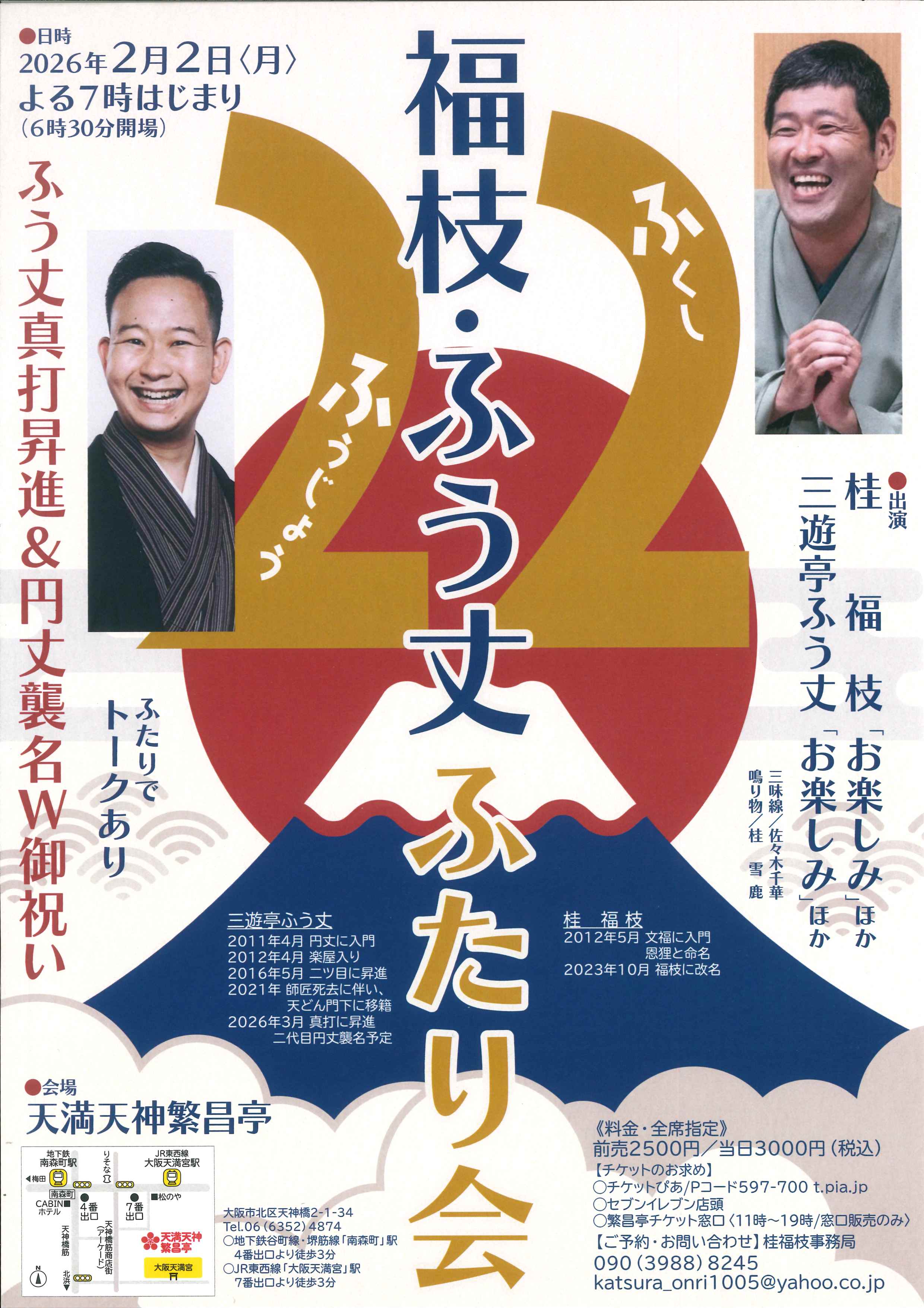 桂福枝の出演予定番組 夜2月2日(月) 福枝・ふう丈ふたり会 ~ふう丈真打昇進&円丈襲名W御祝い~ 桂福枝「お楽しみ」他/三遊亭ふう丈「お楽しみ」他 ※トークあり 開演:午後7時(6時30分開場)全席指定 前売2,500円 当日3,000円 お問合せ:桂福枝事務局 090-3988-8245