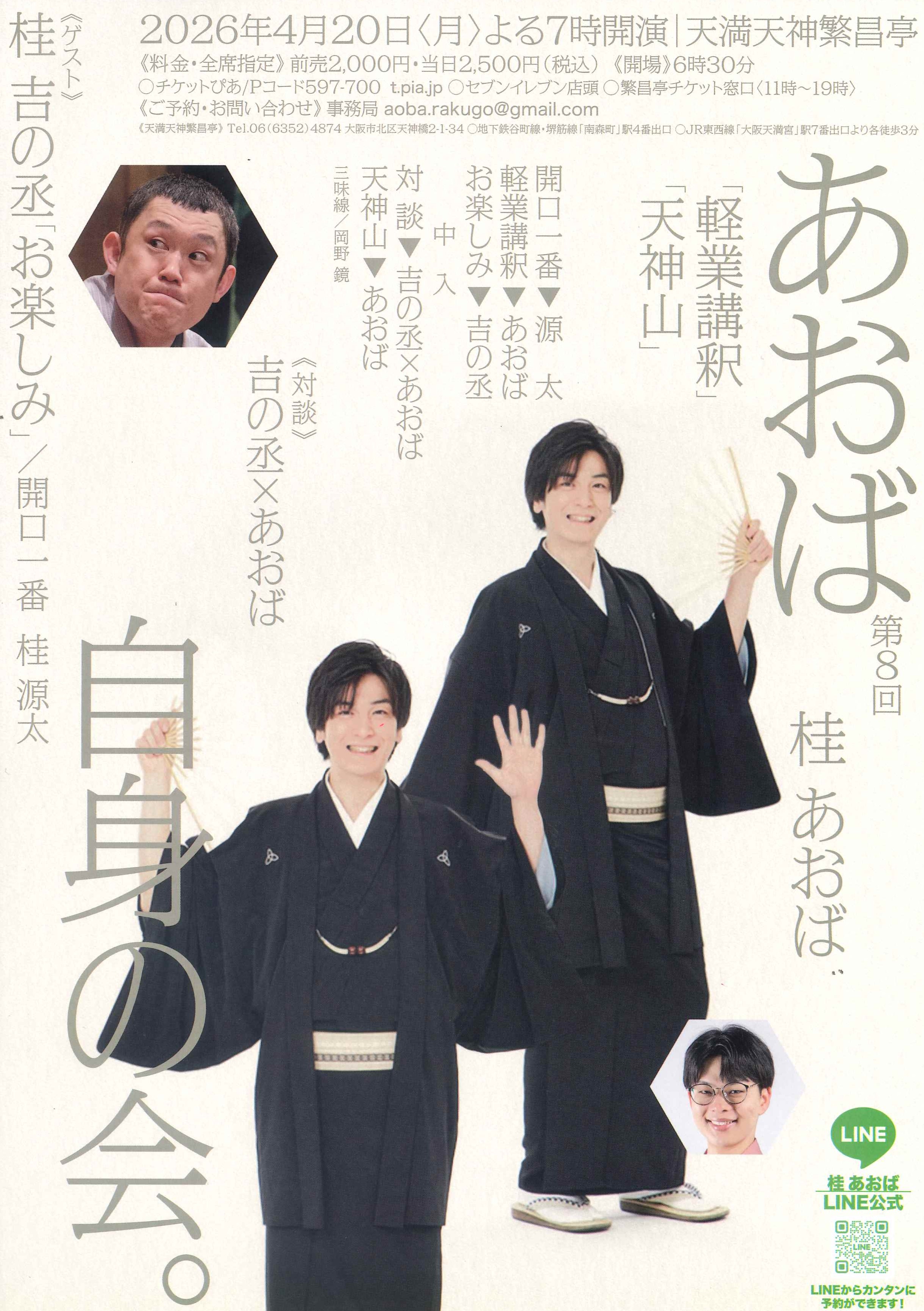 露の眞「蛸坊主」/桂あおば「ラストフライト」/林家染八「狼講釈」/笑福亭大智「時うどん」/月亭遊真「真田小僧」/桂りょうば「あくびの稽古」/桂健枝郎「念には念を」/桂雪鹿「寄合酒」/桂かかお「親指を立てて!」/笑福亭喬路「がまの油」※出演順は当日決定します