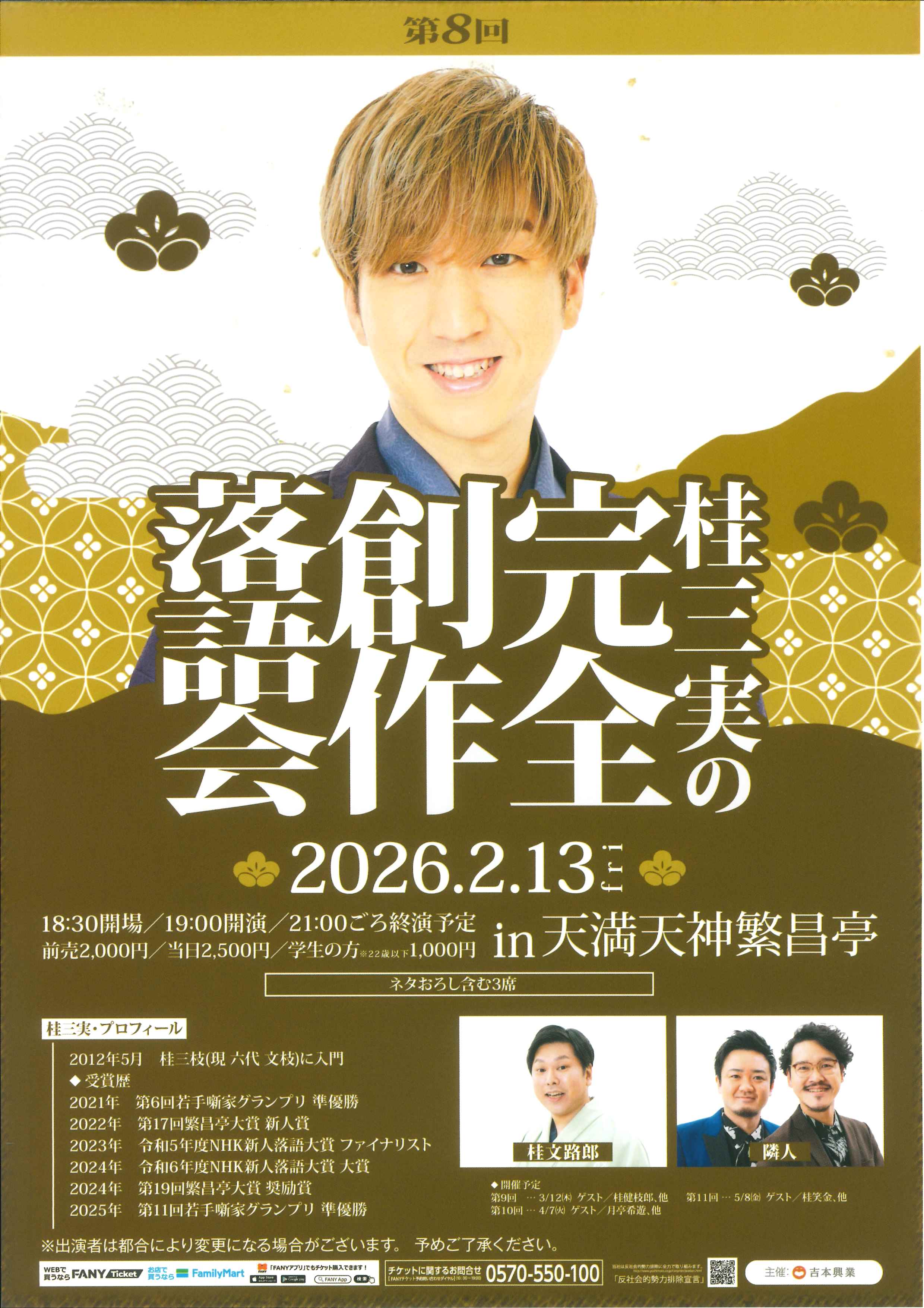 桂文路郎の出演予定番組 夜1月31日(土) 六代文枝一門会 ―2026新春― 桂三実/桂文路郎/桂枝之進/桂笑金 ゲスト:濱田祐太郎/天才ピアニスト 開演:午後6時30分(6時開場)全席指定 前売2,500円 当日3,000円 お問合せ:FANYチケット 0570-550-100(10時~19時) 夜2月13日(金) 桂三実の完全創作落語会 桂三実/桂文路郎/隣人 開演:午後7時(6時30分開場)全席指定 前売 2,000円 当日 2,500円 お問合せ:FANYチケット 0570-550-100 (平日10時~19時)