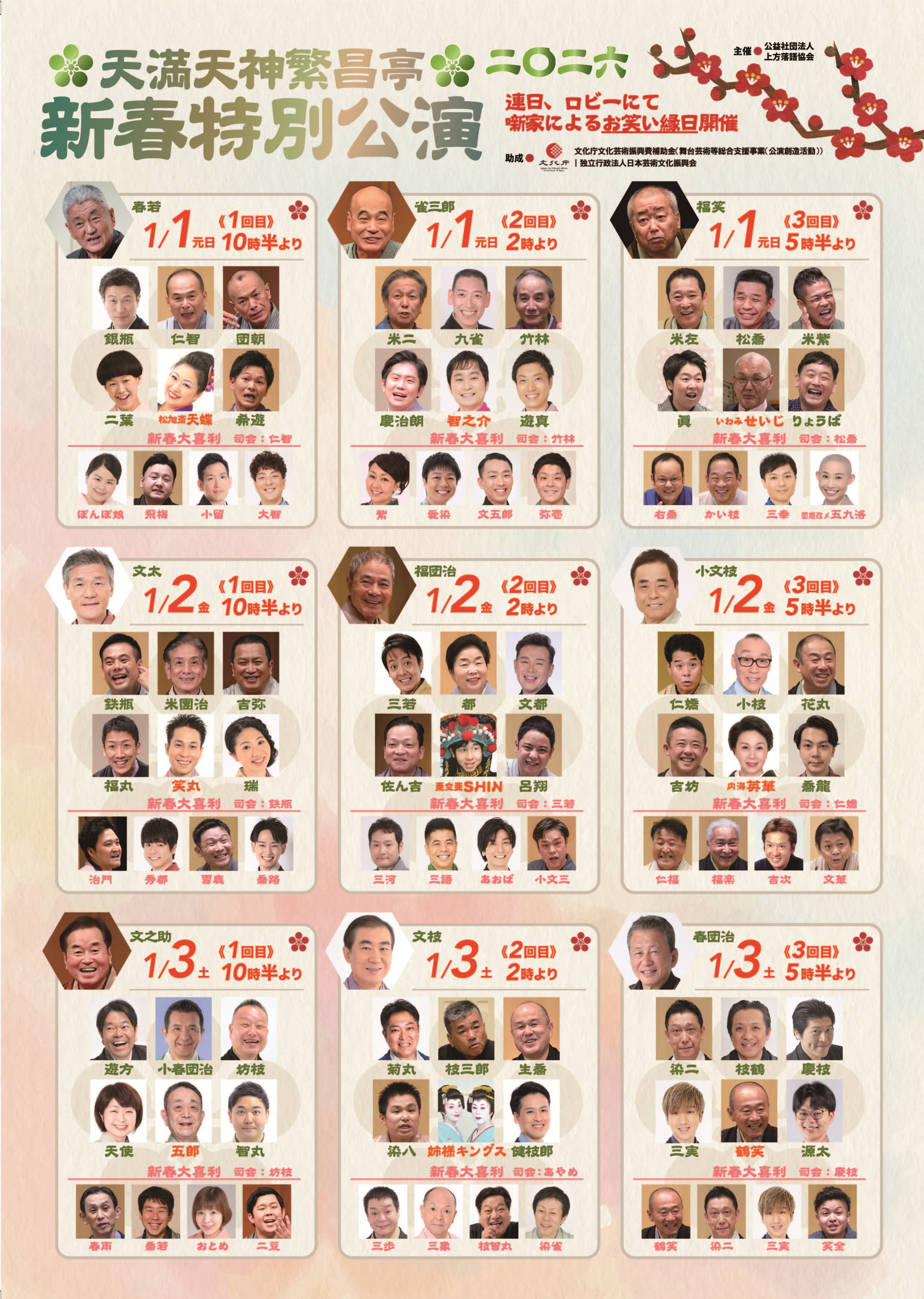 桂源太/桂三実/桂慶枝/笑福亭鶴笑(鶴笑ワールド)/笑福亭枝鶴~仲入~【新春大喜利】鶴笑・染二・三実・笑金・慶枝(司会)/林家染二/桂春団治