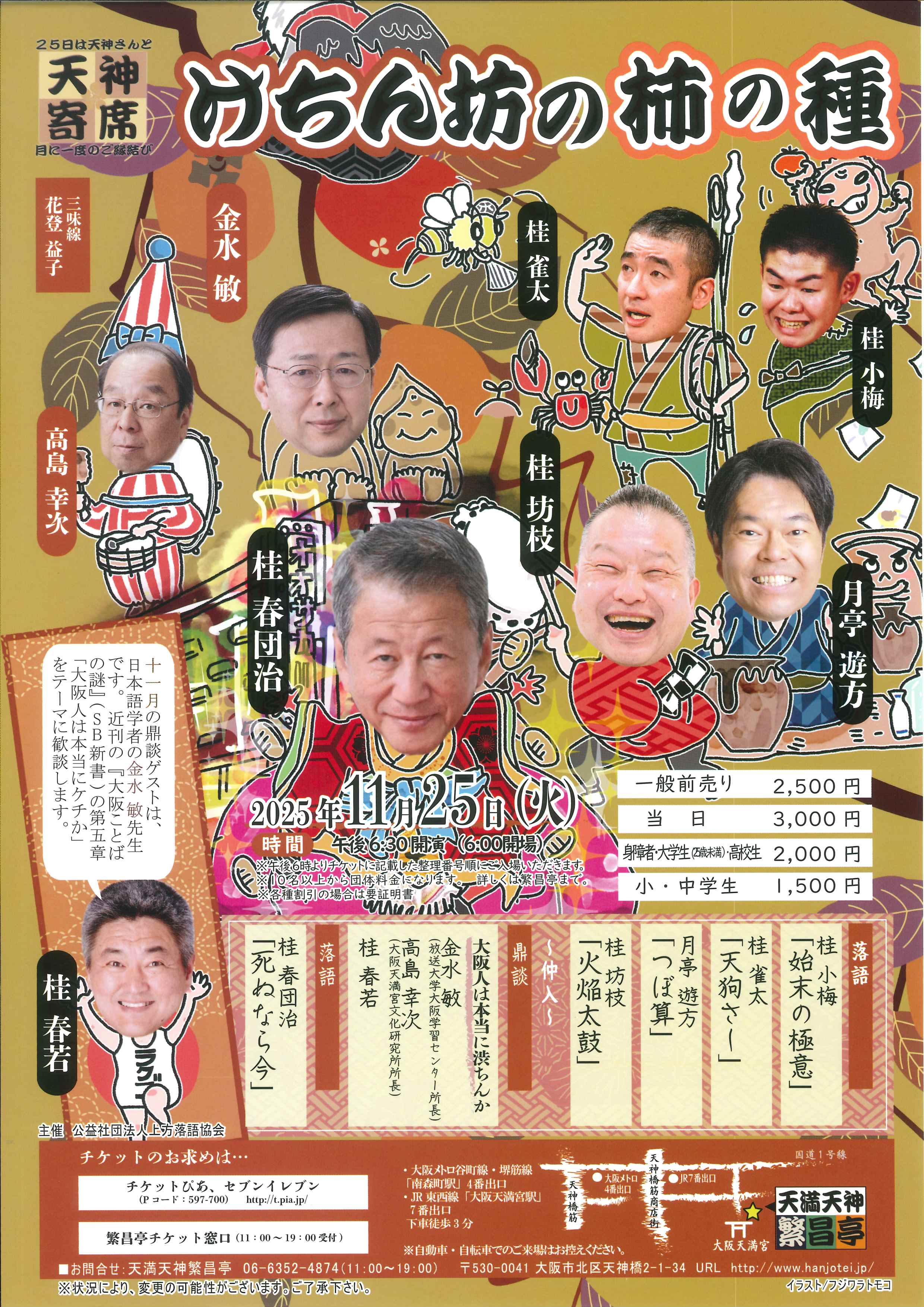 桂春団治の出演予定番組 夜11月25日(火) ◆天神寄席11月席「けちん坊の柿の種」 桂小梅「始末の極意」/桂雀太「天狗さし」/月亭遊方「つぼ算」/桂坊枝「火焔太鼓」~仲入~【鼎談】「大阪人は本当に渋ちんか」金水敏(放送大学大阪学習センター所長)・高島幸次(大阪天満宮文化研究所所長)・桂春若/桂春団治「死ぬなら今」 開演:午後6時30分 *開場時間の6時より、チケットに記載されている整理番号順にご入場いただきます。 前売2,500円 当日3,000円 身障者・大学生(25歳未満)・高校生 2,000円 小中学生1,500円 ※各種割引の場合は要証明書