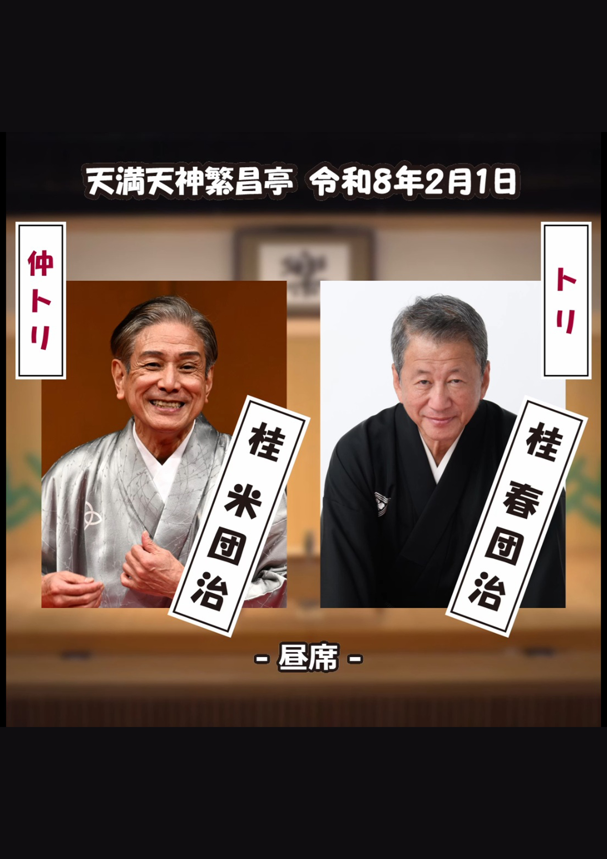 桂かかお/桂三実/桂鯛蔵/パピヨンズ(漫才)/笑福亭飛梅/桂米団治~仲入~桂慶治朗※/笑福亭呂竹/千田やすし(腹話術)/笑福亭枝鶴(※…配信はございません。)