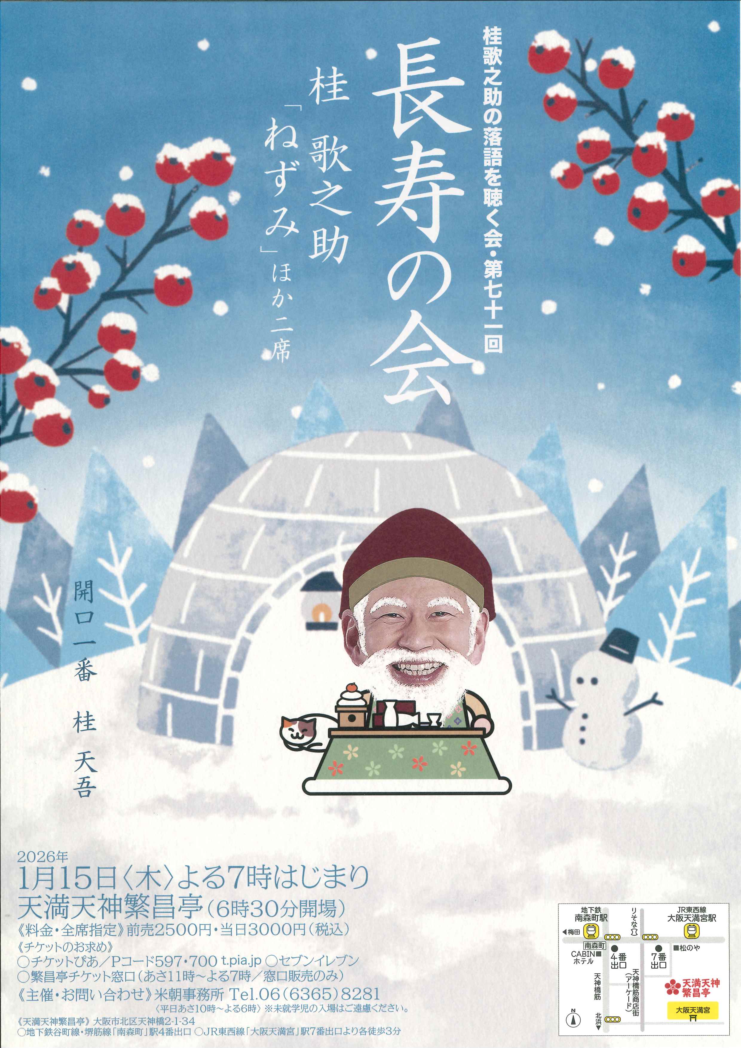 桂歌之助(三代目)の出演予定番組 夜1月15日(木) 第71回 長寿の会 桂歌之助「ねずみ」他二席/桂天吾「開口一番」 開演:午後7時(6時30分開場)全席指定 前売2,500円 当日3,000円 お問合せ:米朝事務所 06-6365-8281(平日10時~18時) 朝1月24日(土) 由瓶のいつかはぷらす八席~復路108席のゴールへ!~ 笑福亭由瓶「十徳」「いらち俥」「花筏」/ゲスト:桂歌之助 開演:午前10時 *開場時間の9時45分より、チケットに記載されている整理番号順にご入場いただきます 前売2,500円 当日3,000円 お問合せ:事務局 090-5167-2665