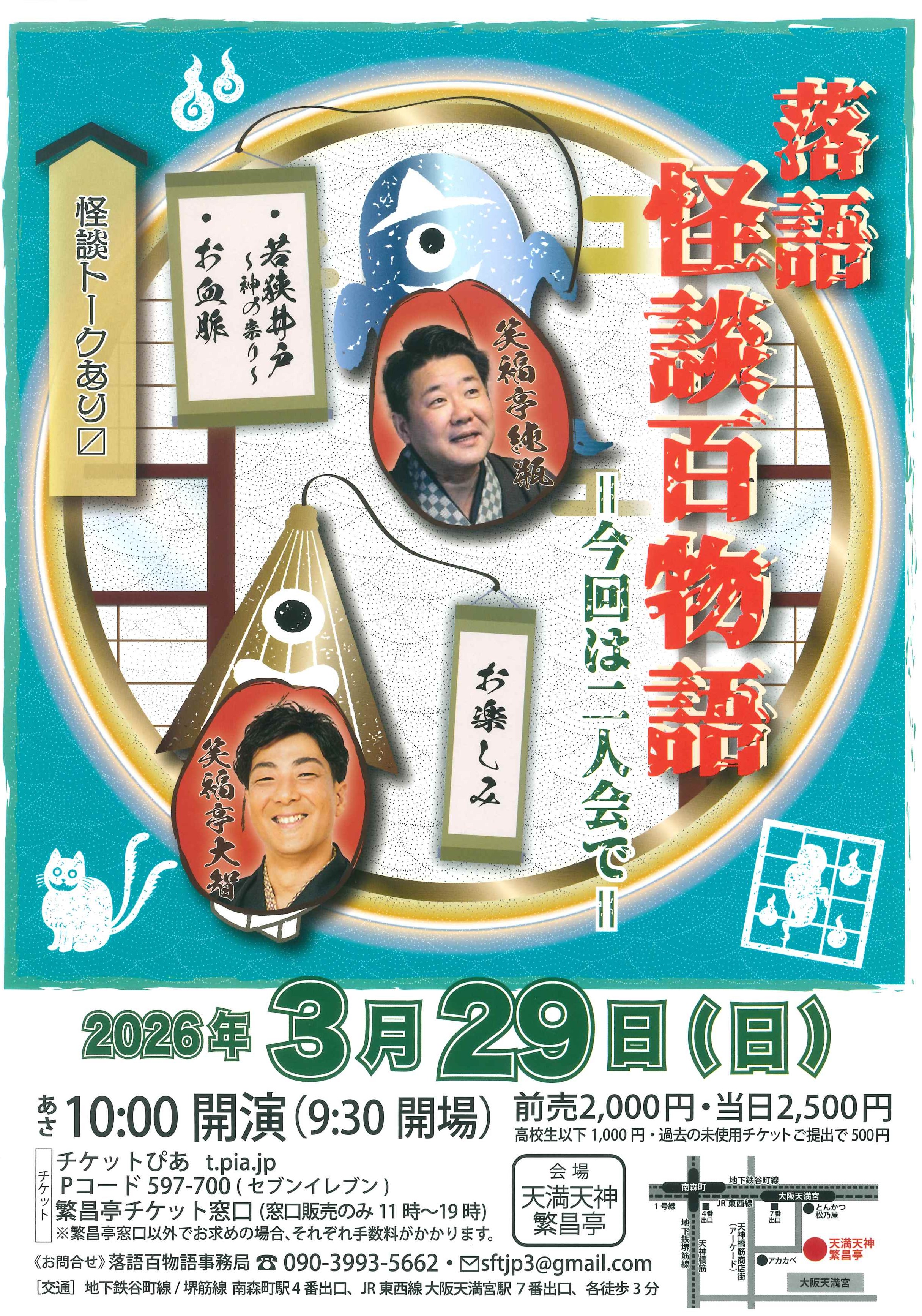 笑福亭純瓶の出演予定番組 朝3月29日(日) 落語・怪談百物語 ~今回は二人会~ 笑福亭純瓶「若狭井戸~神の祟り~」「お血脈」/笑福亭大智「お楽しみ」 ※怪談トーク有 開演:午前10時(9時30分開場) 前売2,000円 当日2,500円 高校生以下 前売・当日共1,000円 お問合せ:落語・怪談百物語事務局 090-3993-5662 sftjp3@gmail.com 昼5月20日(水) 笑福亭鉄瓶 第20回繁昌亭大賞 受賞記念ウィーク 桂健枝郎/笑福亭茶光/林家菊丸/旭堂小南陵(講談)/笑福亭純瓶/桂米団治~仲入~記念口上/森乃石松/内海英華(女道楽)/笑福亭鉄瓶 ★菟道亭配信あり ※3月20日発売予定
