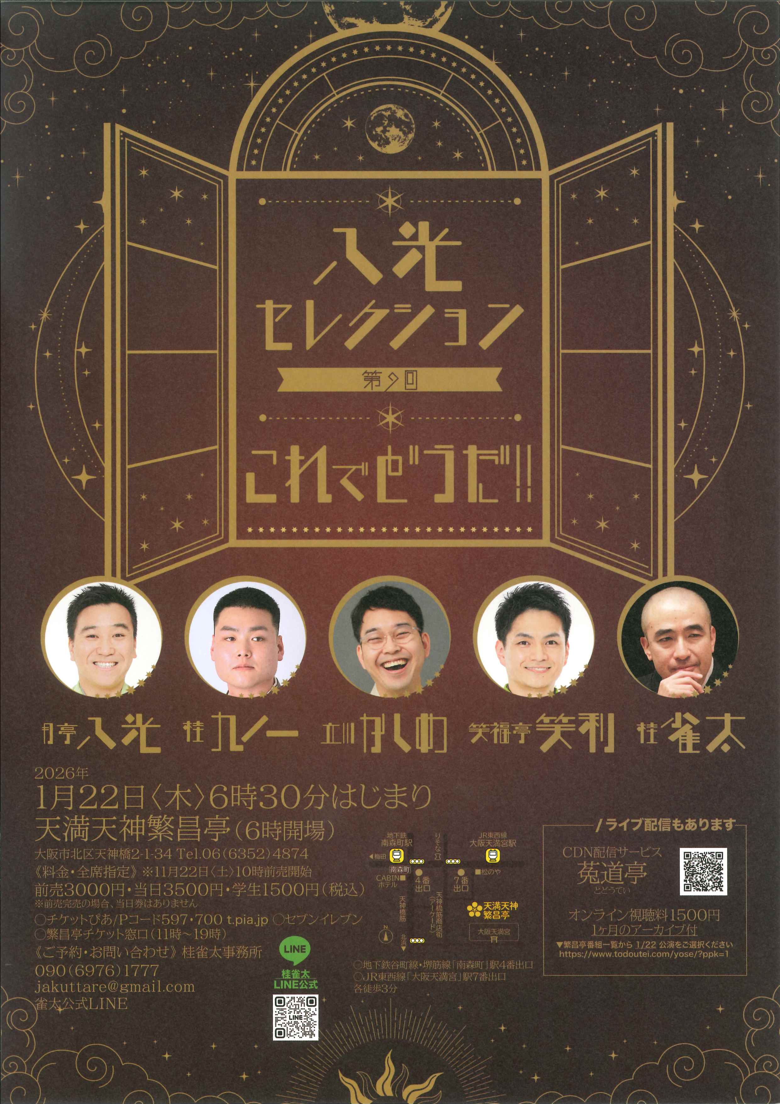 桂源太/笑福亭呂竹/桂吉の丞/ヤングタウン※(漫才)/桂慶治朗/笑福亭ベ瓶※~仲入~笑福亭笑利/桂雀太/アンジェリーナ1/3※/桂三幸(※…配信はございません。)