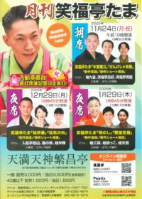 桂源太/桂紋四郎※/桂よね吉※/ボルトボルズ(漫才)/笑福亭たま/露の団六~仲入~桂ぽんぽ娘/桂三歩/岡大介(カンカラ三線)/桂福団治(※…配信はございません。)