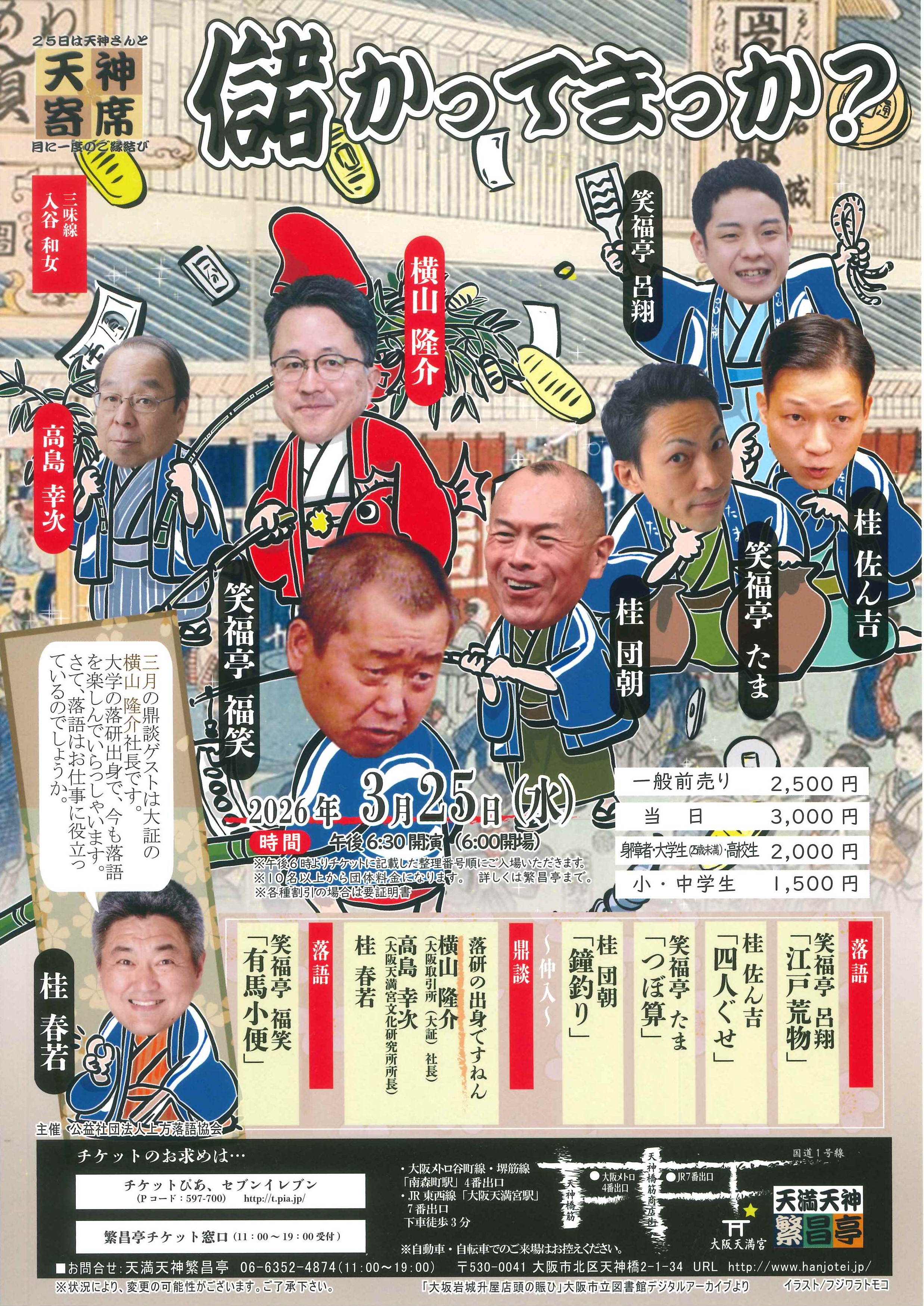 笑福亭呂翔「江戸荒物」/桂佐ん吉「四人ぐせ」/笑福亭たま「つぼ算」/桂団朝「鐘釣り」~仲入~【鼎談】「落研の出身ですねん」横山隆介(大阪取引所(大証)社長)・高島幸次(大阪天満宮文化研究所所長)・桂春若/笑福亭福笑「有馬小便」