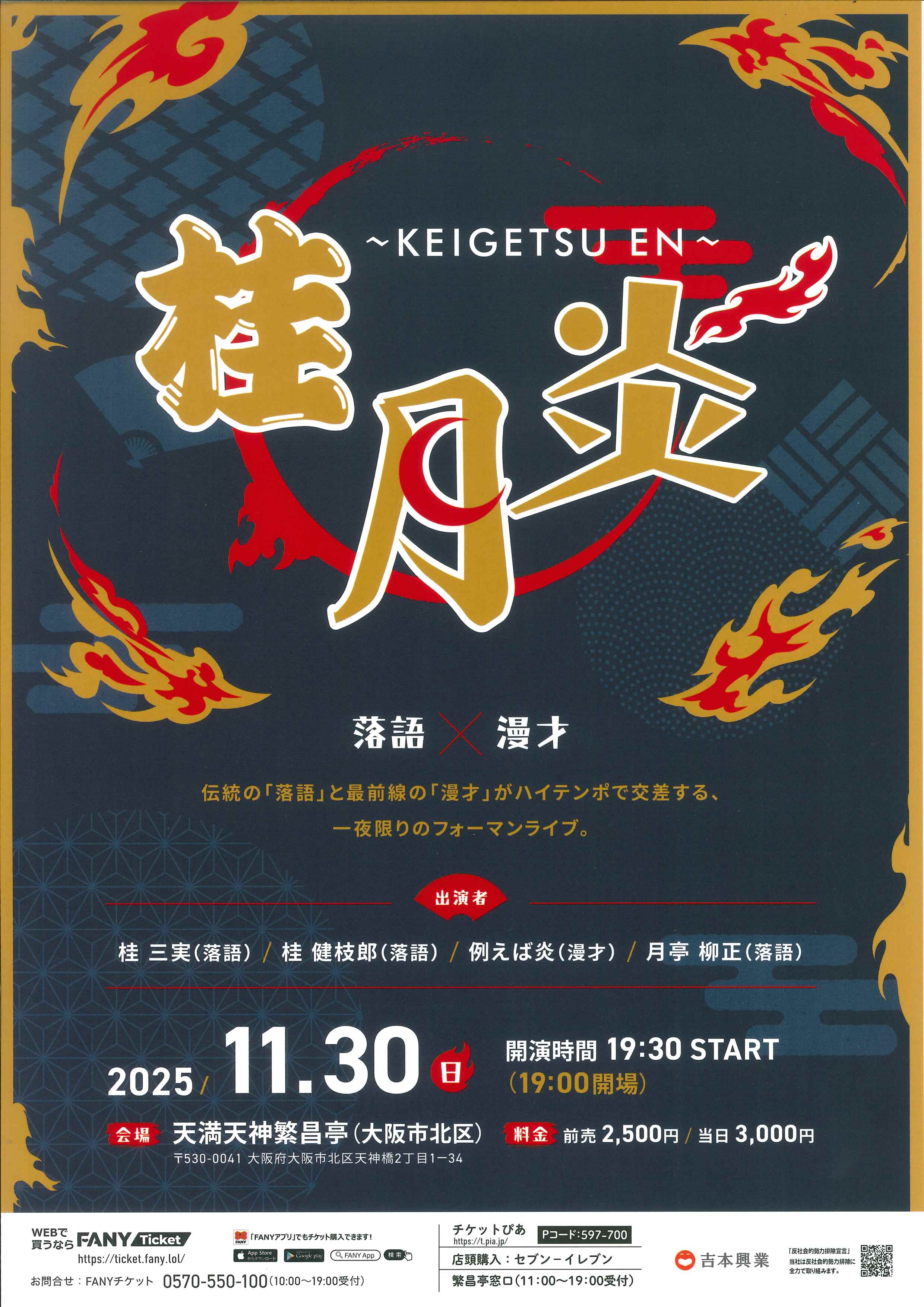月亭柳正の出演予定番組 夜11月30日(日) 桂月_炎 ~KEIGETSU_EN~ 桂三実/桂健枝郎/月亭柳正/例えば炎 開演:午後7時30分(7時開場)全席指定 前売2,500円 当日3,000円 お問合せ:FANYチケット 0570-550-100(10:00~19:00受付) 朝12月7日(日) 朝からたっぷり愛染の会 林家愛染(二席+朝の挨拶)/月亭柳正/ゲスト:桂あやめ 開演:午前10時 *開場時間の9時40分より、チケットに記載されている整理番号順にご入場いただきます 前売2,000円 当日2,500円 お問合せ:あいそめ事務局 080-4018-5450 / info@aisome8848.com